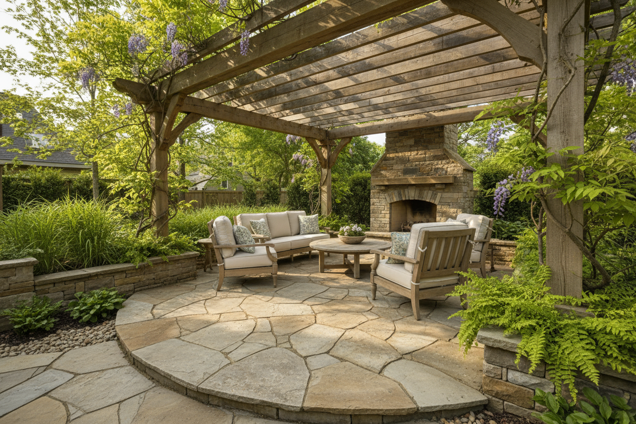 For patio installations like the concept above, you are able to customize your design as much as you want. The concept above shows a beautiful natural flagstone as well as a great fireplace and pergola. We can help you transform your backyard into an amazing place of gathering.